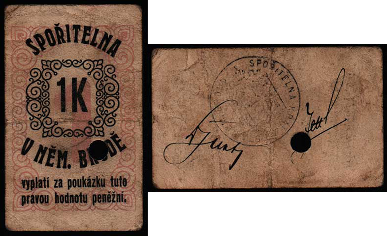 Něm.Brod - Spořitelna, 1 Koruna (1914), D-H.138/1.1a, perforace 1x 5mm, podpisy