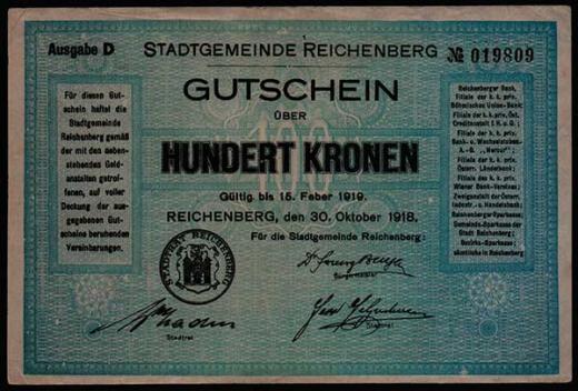 Liberec (Reichenberg), 100 Koruna 1918, D-H.173/6.4a, špendlíková dírka