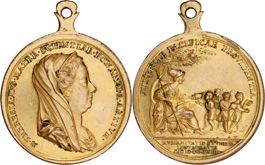 Záslužná medaile pro premianty latinských škol 1774 - poprsí v závoji, opis / sedící Minerva obdarovává školáky, opis a nápis, zlac.bronz 38 mm s pův.ouškem