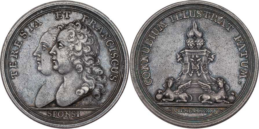 Werner - AR svateb. medaile 1736 - dvojportrét zleva, opis a nápis / hořící srdce na oltáři, opis a nápis, Sign., 43mm, 27.598g, M.1672, H.2837, rys., patina R!