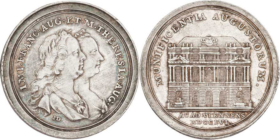 Doner - AR medaile na otevření vídeň. university 1756 - dvojportrét zprava, opis / průčelí university, písmo, 29mm, 9.091g, M.1845, H.2912, dr.hr., dr.rysky