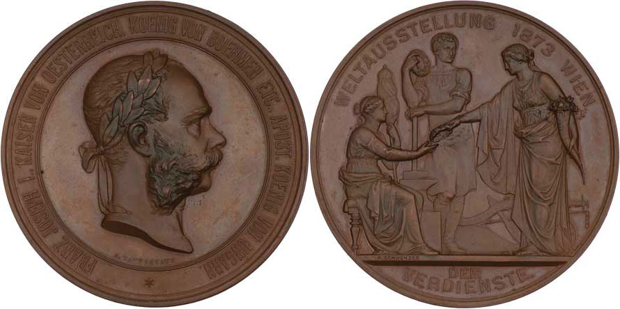 Tautenhayn - světová výstava 1873 - DEM VERDIENSTE - portrét zprava, němec. opis / tři alegorické postavy, opis a nápis, Sign., měď 70 mm, Haus.2911, patina