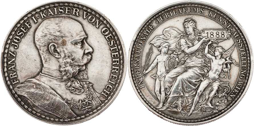 Scharff - Jubilejní umělecká výstava ve Vídni 1888 - poprsí zprava, opis / alegorické postavy, letopočet na tabulce, opis, Sign., Punc., Ag 36mm, 24.871g