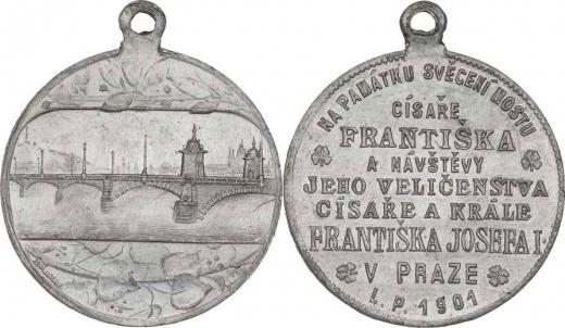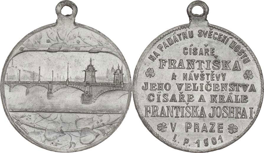 Šmakal - návštěva v Praze a svěcení mostu 1901 - pohled na most, vavřínové a lipové snítky / 9-řádkový nápis, Sign., cín 33 mm s pův.ouškem, nep.rysky, tém.