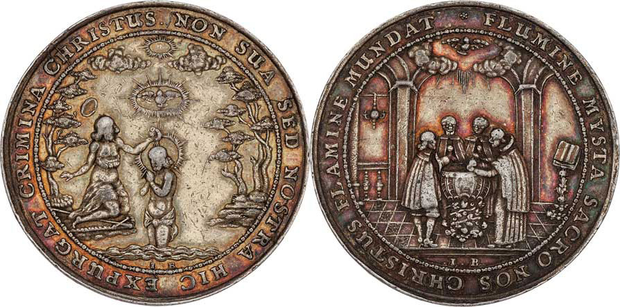 Buchheim (Sign.IB) - sv. Jan křtí Krista, Duch Svatý, krajina, lat.opis / křest dítěte v chrámu, Duch Svatý, lat.opis, zlacené Ag 40mm, 16.017g, dr.hr.