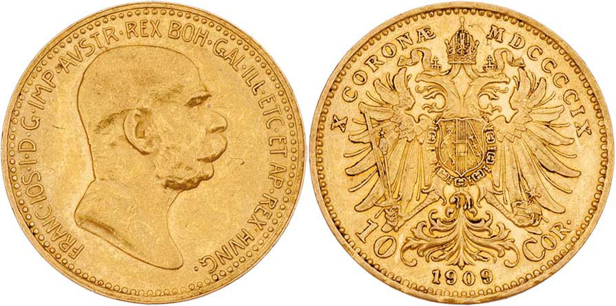 10 Koruna 1909 - Marschall, 3.388g, nep.hr., nep.rysky, téměř