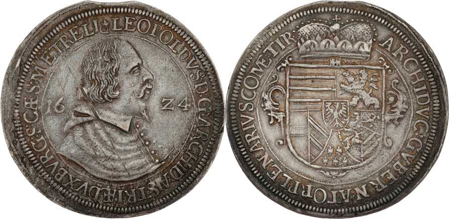 Tolar 1624, Hall, M-A.118, M-T.453, KM.264.2, církev. šat, letopočet dělený poprsím, koruna s perlami, "..TIR.", 28.049g, krajový střížek, pěkná patina