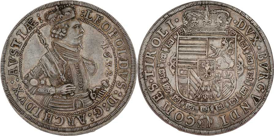 Tolar 1632, Hall, M-A.129, M-T.473, KM.629.2, světský šat, znak s řádem Zlatého rouna, koruna bez perel, "..TIROLI.", 28.793g, pěkná patina