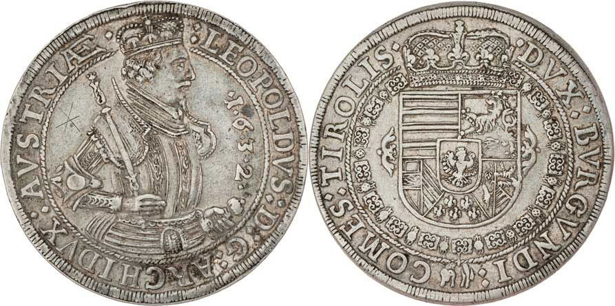 Tolar 1632, Hall, M-A.129, M-T.473, KM.629.2, světský šat, znak s řádem Zlatého rouna, koruna s perlami, "..TIROLIS.", 28.593g, pěkná patina, grafitti "*"