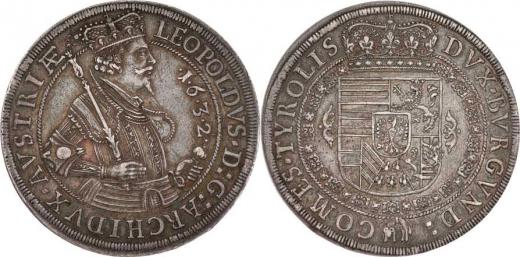 Tolar 1632, Hall, M-A.129, M-T.473, KM.629.2, světský šat, znak s řádem Zlatého rouna, koruna s perlami, opis končí "..TYROLIS.", 28.423g, dr.rys., pěkná pat.
