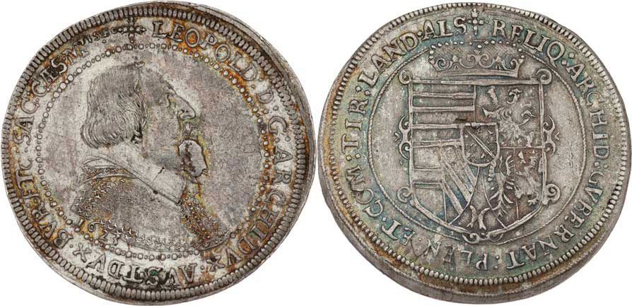 Tolar 1623, Ensisheim, M-A.116, KM.257.1, církevní šat, letopočet pod poprsím, 28.495g, drobné vady razidla, pěkná patina