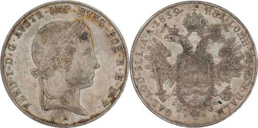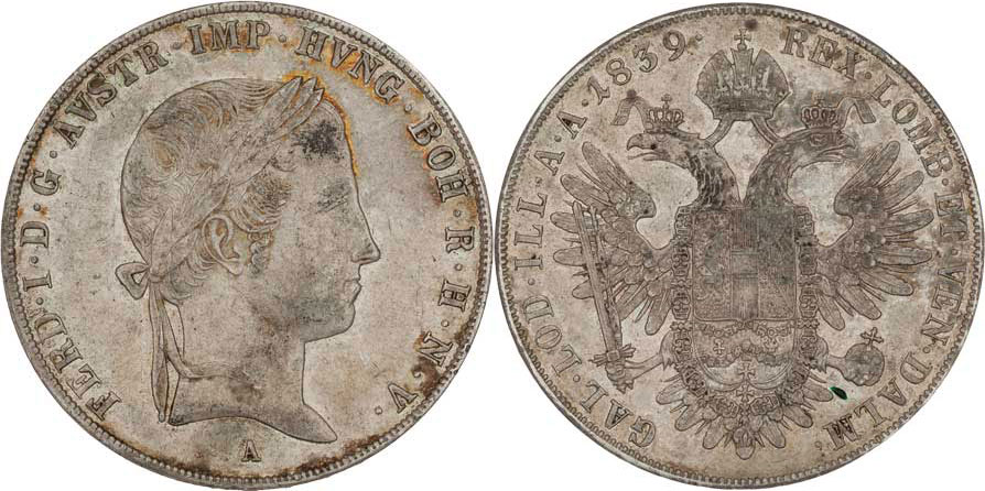 Tolar 1839 A, 27.946g, nep.hr., nep.rysky, patina, starý podložní lístek, část Chaurovy značky R!