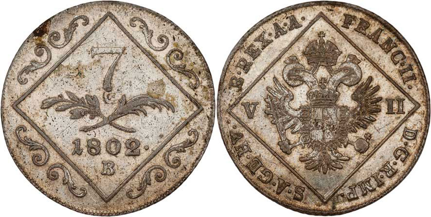 7 Krejcar 1802 B - dobře patrné stopy přeražby, 4.916g, nep.nedor., pěkná patina, téměř
