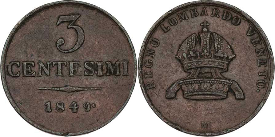 3 Centesimi 1849 M - větší typ, 5.001g, hr., rysky, patina