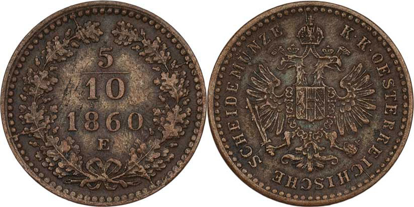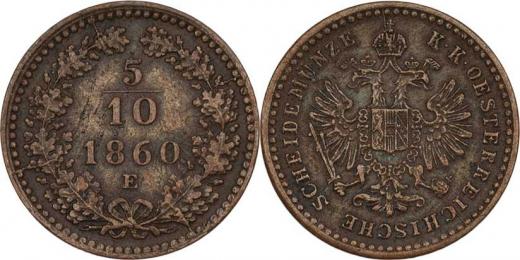 5/10 Krejcaru 1860 E, 1.555g, dr.vady razidla, nep.hr., nep.rysky, pěkná patina R!