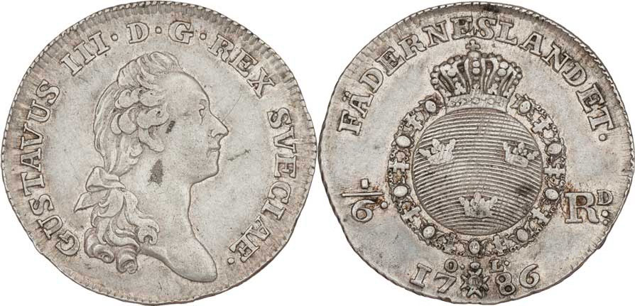 1/6 Riksdaleru 1786 OL, KM.516 (Ag691), 6.138g, mírně just., dr.hr., dr.rysky, pěkná patina R!