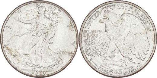 1/2 Dolar 1936 D - stojící Liberty, KM.142, 12.476g, nep.hr., nep.rysky, téměř