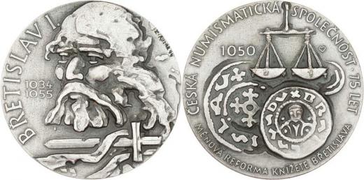 Kozák a Vitanovský - 75 let ČNS 1919 / 1994 - Břetislav I. zleva, meč, vročení a opis/ mince, minc. váhy, písmo, Sign., Ag990, 60mm, FM.37C (25ks) RR!