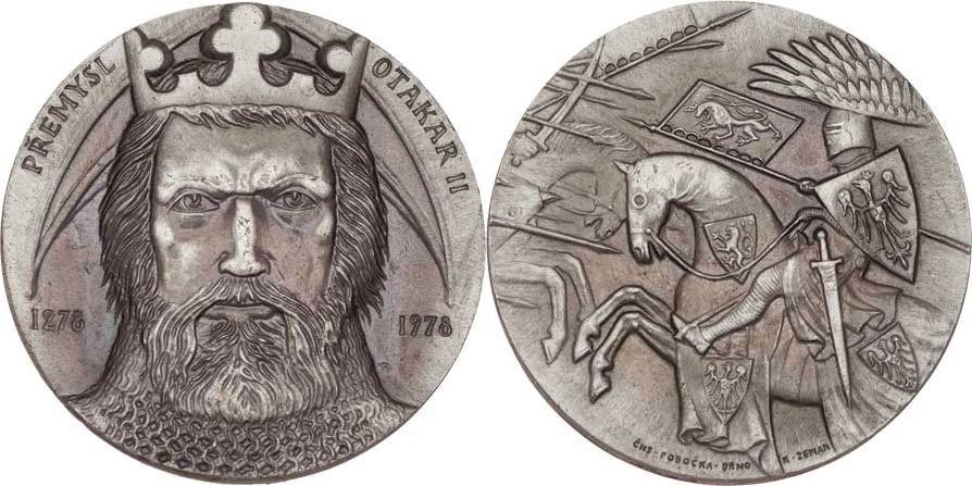 Zeman - 700 let úmrtí Přemysla Otakara II. 1978 - korunovaná hlava zpředu, vročení, opis/ panovník na koni v bitvě, Sign., Punc., Ag 42mm, 48.922g, BK.8