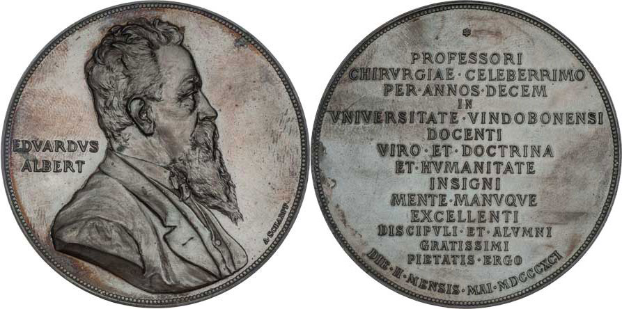 MUDr.Eduard Albert - profesor Vídeň.university 1891 - poprsí zprava, nápis / patnáctiřádkový nápis, Sign., bronz 63mm, 109.493g, Bach.174a, krásná patina