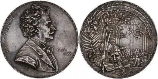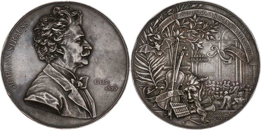 Johann Strauss - na 50 let umělecké činnosti 1894 - poprsí zprava, opis a nápis / maska, hudební nástroje a tanečníci, Sign., Punc., Ag 60mm, 69.638g, hr.,pat.