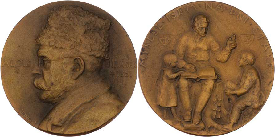 Alois Jirásek b.l. (1914) - poprsí zleva, nápis / učitel s dětmi nad knihou, znaky, opis, Sign., patinovaný bronz 50 mm, MZČ.222/17