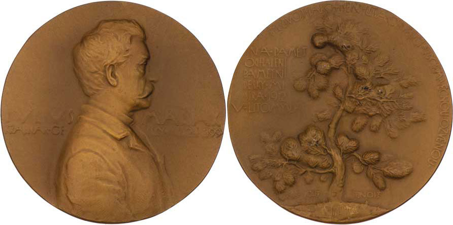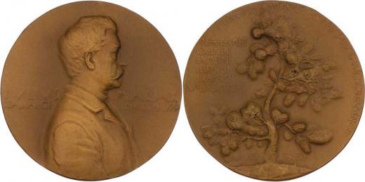 Julius Mařák - odhalení pam. desky v Litomyšli 1912 - poprsí zprava, nápis / borovice, šestiřádkový nápis a opis, Sign., patin.bronz 60mm, pouze 145ks, dr.hr.