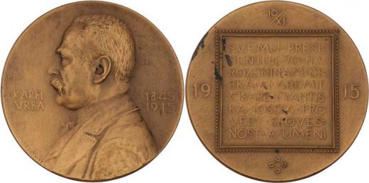Karel Vrba - Česká akademie na 70.narozeniny 1915 - poprsí zleva, opis / osmiřádkový nápis ve čtverci, vročení, Sign., patin.bronz 58mm, 45ks(?), skvr. RR!