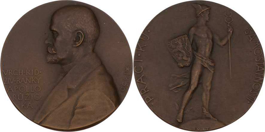 Růžička - vrchní řiditel banky Apollo 1917 - poprsí zleva, 5-řádkový nápis / Merkur nese český znak, opis, Sign., patin. bronz 50 mm, pouze 125ks R!