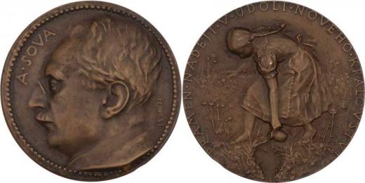 Antonín Sova - pamětní medaile 1917 - poprsí zleva, perlovec, nápis/ dívka nabírá vodu ze studánky, opis, Sign., patinovaný bronz 50 mm