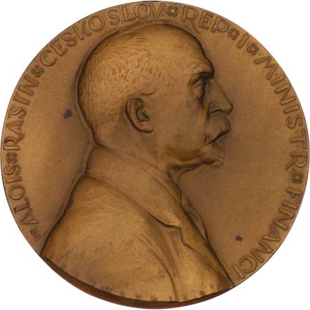 Alois Rašín - první ministr financí ČSR 1922 - poprsí zprava, opis, Sign., patinovaný jednostranný bronz 60 mm, nep.skvrnky R!