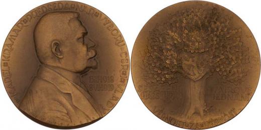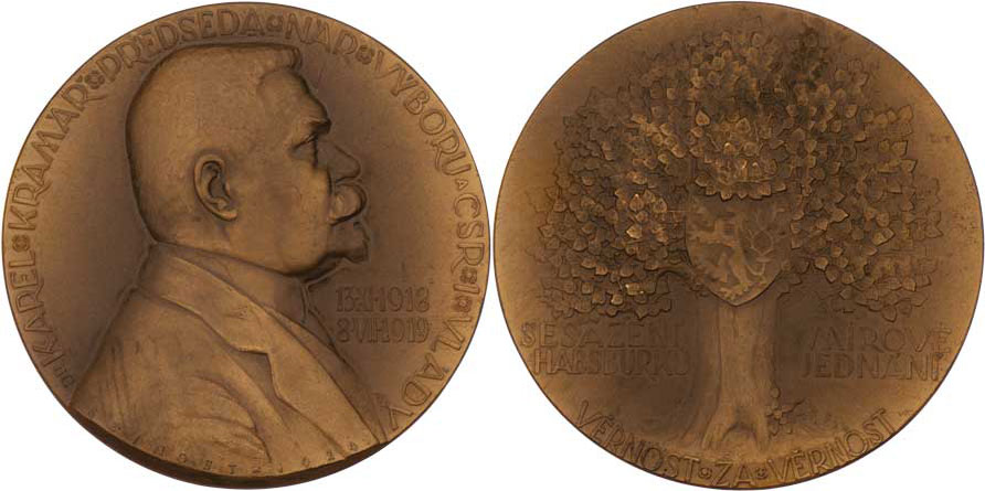 Dr.Karel Kramář - první předseda vlády 1924 - poprsí zprava, vročení, opis / malý státní znak na kmenu lípy, opis a nápis, patinovaný bronz 60mm