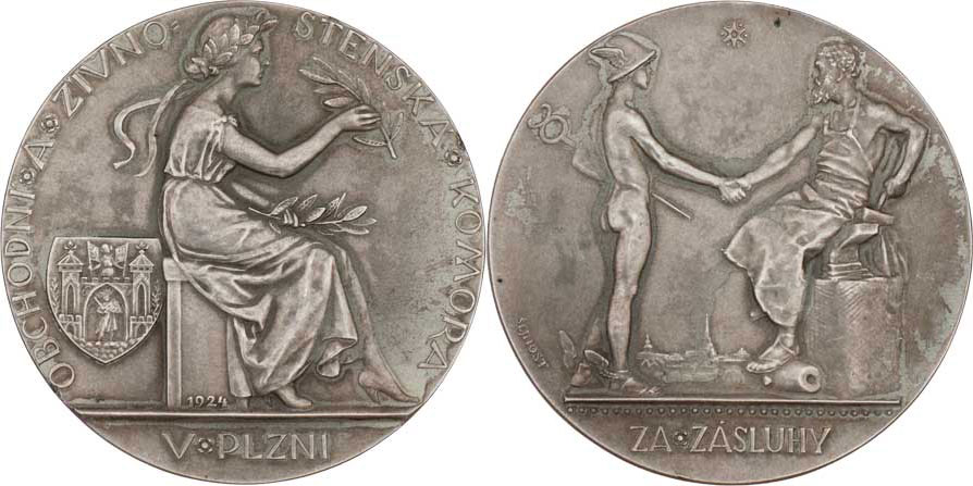 Obchodní a živn.komora v Plzni - Za zásluhy 1924 - Merkur a Vulkán si podávají ruce, nápis/ sedící žena, znak, písmo, Ag750, 50mm, 54.095g, pouze 3ks(?) RRR!