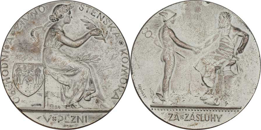Obchodní a živn.komora v Plzni - Za zásluhy 1924 - Merkur a Vulkán si podávají ruce, nápis/ sedící žena, znak, písmo, patin. postř. bronz 50 mm, 1ks! RRR!