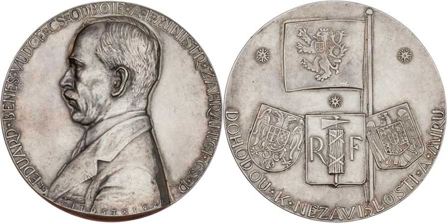 Ed.Beneš - vůdce odboje a I.ministr zahraničí 1926 - poprsí zleva, opis / prapor se lvem, znaky spojenců, opis, Sign., pat. Ag987, 60mm, 111.558g, 3ks RRR!