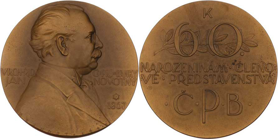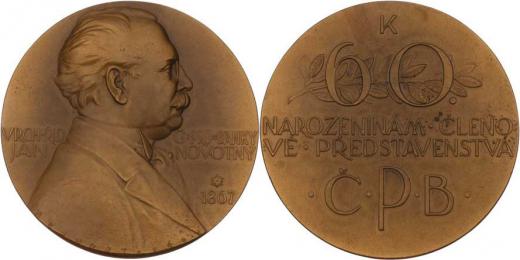 Jan Novotný - vrchní řiditel Čsl.průmysl.banky 1927 - poprsí zprava, nápis / velká "60", vavřínová ratolest a nápis, Sign., patinovaný bronz 60 mm, téměř