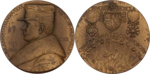 Milan Rastislav Štefánik - I.ministr války ČSR 1928 - poprsí zleva, písmo / hořící slunce, dvě vyznamenání, znak a písmo, Sign., patin.bronz 60mm, 133ks, skv. R!