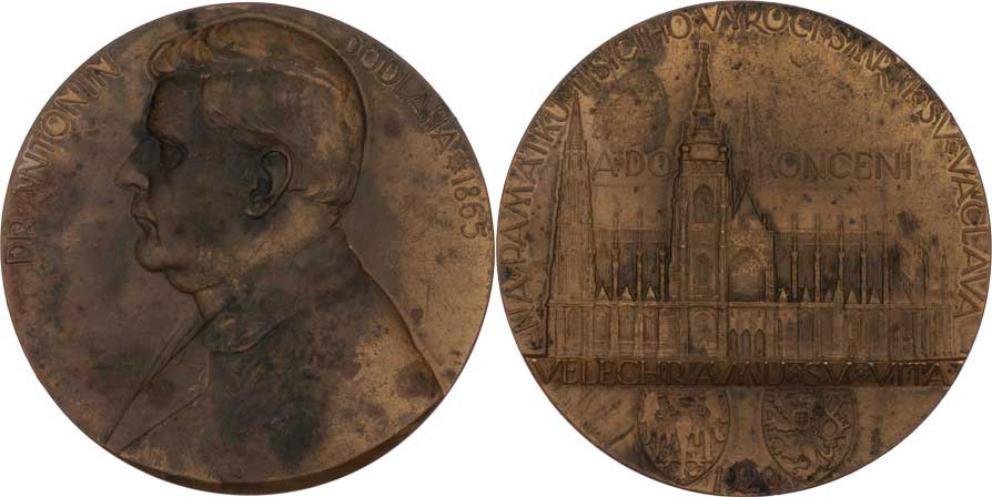 Dr.Ant.Podlaha - dokončení velechrámu sv.Víta 1929 - poprsí zleva, opis / budova katedrály, zemské znaky, nápis a opis, Sign., pat.bronz 70 mm, 125ks, skv. R!
