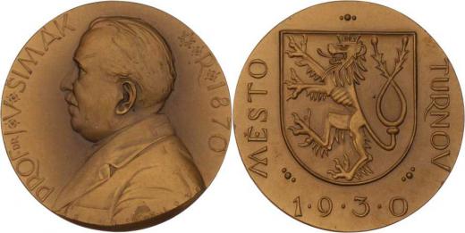 Prof.Dr.J.V.Šimák, historik - město Turnov 1870/1930 - poprsí zleva, opis / štít s českým lvem, nápisy, Sign., patinovaný bronz 50 mm, pouze 100ks RR!