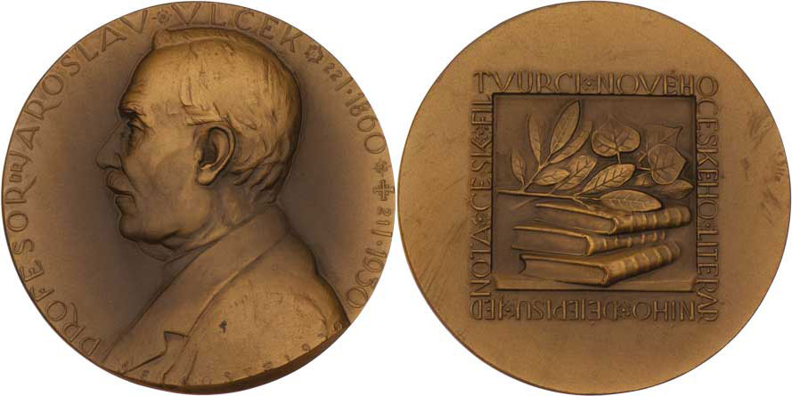 Prof.J.Vlček, literární historik - 70.narozeniny 1930 - poprsí zleva, opis / tři knihy, dvě snítky, nápis do čtverce, Sign., patinov.bronz 65 mm, 100ks RR!