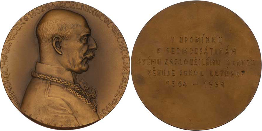 Dr.Jindřich Vaníček (náčelník ČOS 1892 - 1931) 1933 - poprsí zprava, opis, Sign., jednostranný patinovaný bronz 70 mm, věnování "...Sokol Letňany 1864 - 1934"