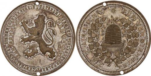 Kříž - Ústřední zemský spolek včelařský - český lev, dvojitý opis / úl a včely, věnec a opis, Sign., jako ŠFP.12, ale postř.bronz 40mm se 2 malými dírkami