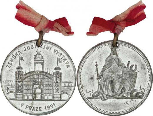 Fritsche/Thein - malá česká upomínková medaile - sedící Čechie čelně v hladkém kruhu / Průmyslový palác, opis, Nesign., cín 30 mm, ŠFP.34e, patina