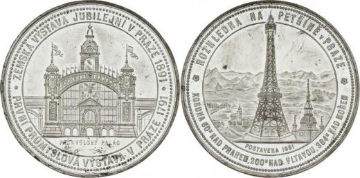 Průmyslový palác, český opis / Petřínská rozhledna, český opis, Nesign., cín 54 mm, ŠFP.62b, dr.hr., nep.rysky, téměř