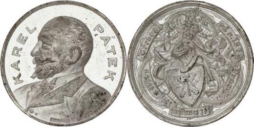 Karel Pátek - autoportrét zleva, opis - rytecké nářadí v erbu, helmice, český opis na stuze, cín 27mm, 8.251g, ŠFP.78c, krásná hluboká ražba R!