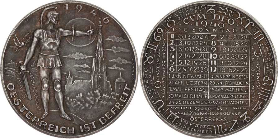 Hofmann - AR kalendářní medaile na rok 1946 - stojící Mars, chrám sv.Štěpána, opis / kalendář, Sign., Punc. patinované Ag900, 40mm, 26.437g