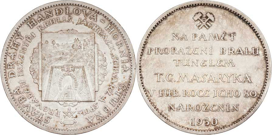 Hám - dráha Handlová-Hor.Štubňa - tunel TGM 1930 - portál tunelu, dvojitý opis/ 7-řádk. nápis, hornická kladívka, postř.bronz 40mm, 24.275g, dr.hr. RR!