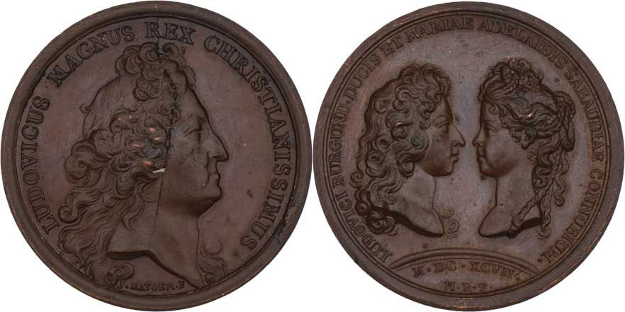 Ludvík XIV. - svatba následníka trůnu 1697 - poprsí zprava, opis / portréty novomanželů, opis, Sign.J. Mauger, měď 41mm, 35.728g, prasklina v razidle, pat.