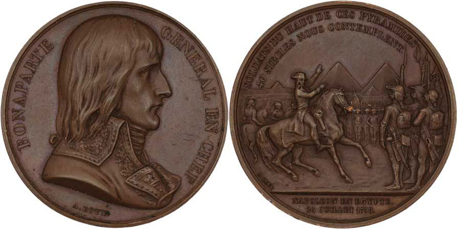Bovy - AE medaile na bitvu u pyramid 1798 - poprsí zprava, opis / konzul na koni, vojsko, pyramidy, nápisy, Sign., 41mm, 38.414g, zn.CUIVRE, Zeitz.0 RR!