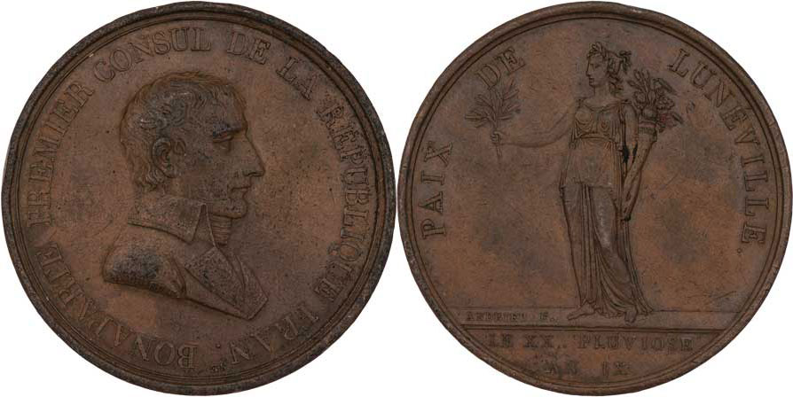 Andrieu - AE medaile na mír v Luneville 1801 - poprsí zprava, opis / personifikace Míru, opis a nápis, Sign., 42mm, 37.044g, Zeitz.21, hrany, rysky, patina